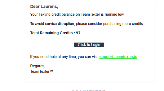 - Resolution: To address this, we've introduced email alerts to notify users when their credits are low. Such that 3 emails will be sent when company reaches at 100,75 and 50 texting credits. Additionally, once a company account reaches 50 remaining credits, no new messages can be sent via the website until additional credits are added. This ensures greater transparency and prevents confusion, as only credits consumed by messages already in the queue will be deducted.